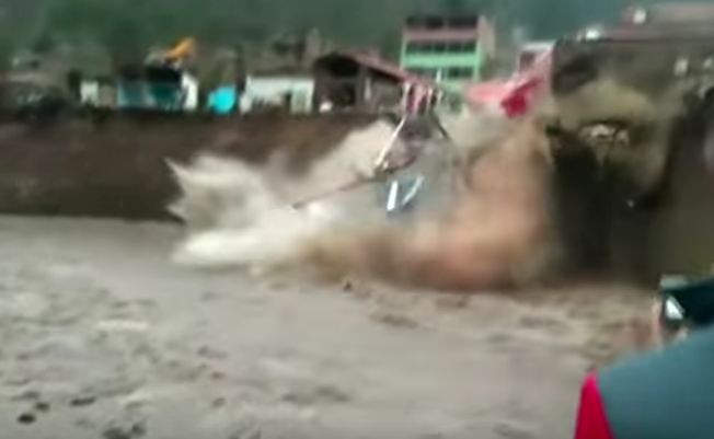 Dramatic television images showed the moment a colonial-era hotel, collapsed into the swollen waters of Sicra River in the Peruvian town of Lircay, in the district of Angaraes on Thursday.