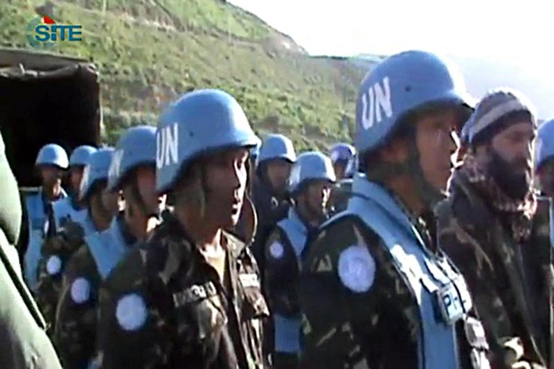 This image taken from video released by the SITE Intelligence Group on March 9 shows Filipino UN peacekeepers of the United Nations Disengagement Observer Force (UNDOF) in Jordan after being released. (AFP)