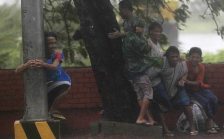 A boy hugs an electric post while other people take cover under a tree as strong winds brought by Typhoon Rammasun, locally called Glenda, battered the capital, metro Manila. (REUTERS)