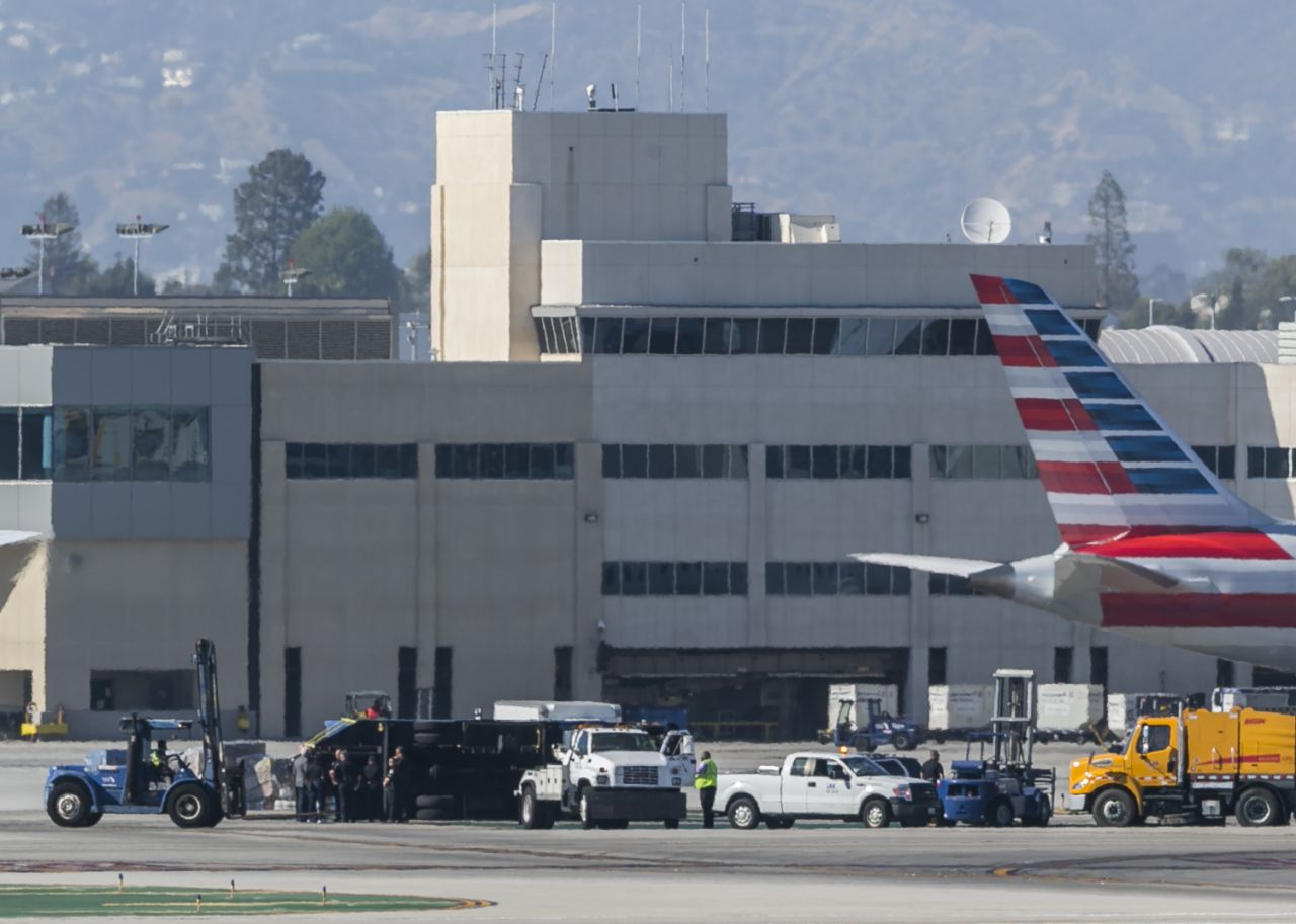 Police say an Aeromexico plane taxiing toward a gate at Los Angeles International Airport was crossing a service road when it struck a supply truck, causing the vehicle to overturn and resulting in eight injuries.