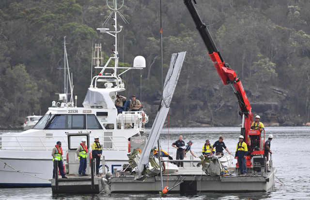 Australian air crash investigators and police on Thursday hoisted the wreckage of a seaplane from the Sydney river where it sank after crashing on New Year's Eve, killing six people including the chief executive of British catering company Compass Group Plc.