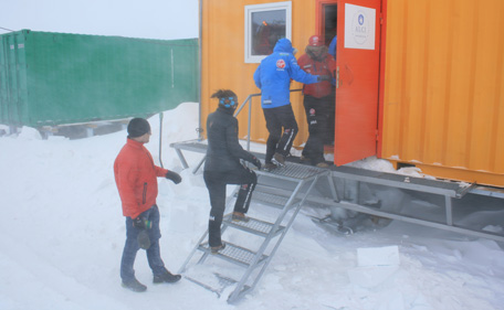 An undated handout photo issued by Walking with the Wounded (WWTW) on November 22, 2013 shows members of Team UK in the South Pole Allied Challenge 2013 expedition, heading into the canteen at Novo, Antarctica, after arriving before starting a charity walk to the South Pole. Britain's Prince Harry has arrived in Antarctica ahead of the charity trek involving wounded servicemen and women. The 29-year-old army attack helicopter pilot, other supporters and 12 injured personnel arrived at the Novo airbase on November 22, 2013 , where they are expected to stay for the next couple of days to acclimatise to the Antarctic weather and make final preparations for the charity race to the planet's southernmost point, which is expected to take 16 days. RESTRICTED TO EDITORIAL USE - MANDATORY CREDIT " (AFP)
