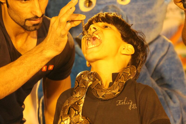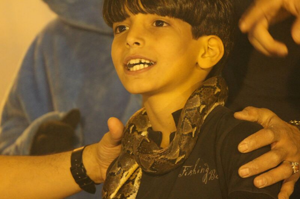 A 10-year-old Saudi boy stunned hundreds of people attending a summer festival when he put live snakes and spiders inside his mouth and letting a Copra bite his hand.