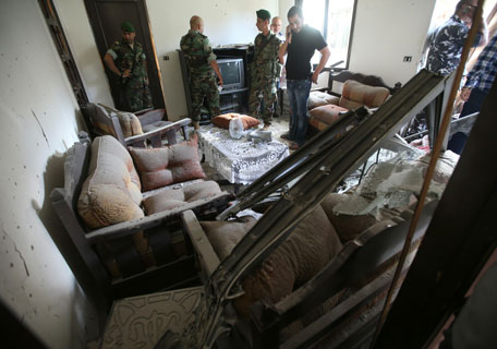 Lebanese army soldiers investigate at a damaged room where a rocket struck an apartment in a building at Chiyah district, south of Beirut, Lebanon, Sunday May 26, 2013.(AP)