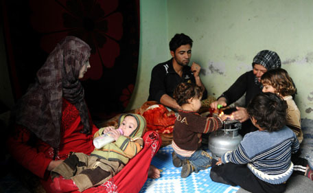 A Syrian woman holds her baby as her family gathers around a stove in a refugee camp in Reyhanli, near the Reyhanli border crossing with Syria, on January 15, 2014. (AFP)