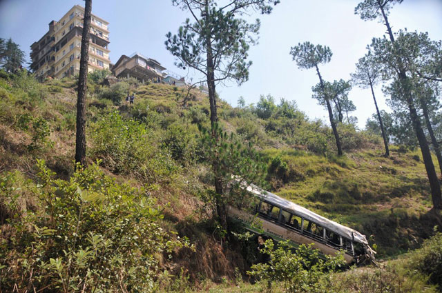 The bus plunged off the Himalayan mountain road as its driver negotiated a curve and rolled down into a 150-meter (500-foot) deep gorge along a rocky stream, said civil administrator Angrez Singh Rana.