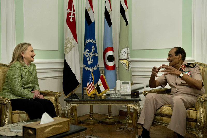 Clinton's meeting with Field Marshal Hussein Tantawi in Cairo came with Egypt's transformation from dictatorship to democracy in peril. Clinton and Tantawi met for more than an hour.