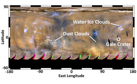This global map of Mars was acquired on Aug. 4, 2012, by the Mars Color Imager instrument on NASA's Mars Reconnaissance Orbiter. One global map is generated each day to forecast weather conditions for the entry, descent and landing of NASA's Curiosity rover. The atmosphere is clear and seasonal around Gale Crater, in agreement with the computer models used to simulate Curiosity's landing. The dust storm southwest of Gale Crater, first seen on July 31, changed into an inactive dust cloud on Aug. 2, and now has dispersed even further. Dust activity is picking up on the other side of the planet, as shown by the dust clouds marked on the left side of the map. None of these dust clouds will arrive at Gale Crater before Curiosity does.