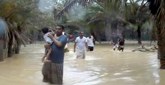 An image grab taken from an AFPTV video shows people walking through flood water as they evacuate a flooded area during a cyclone in the Yemeni island of Socotra. (AFP)
