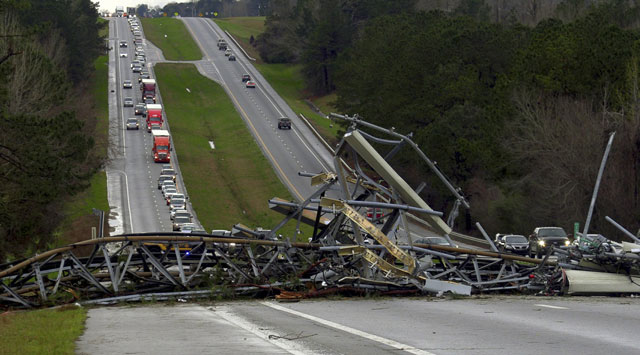Jones said the twister traveled straight down a key local artery in Beauregard and that the path of damage and destruction appeared at least a half mile wide. He said single-family homes and mobile homes were destroyed, adding some homes were reduced to slabs. He had told reporters earlier that several people were taken to hospitals, some with “very serious injuries.”