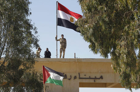 An Egyptian soldier (top) holding on to the national flag keeps watch on the Egyptian side of the Rafah border crossing as a Palestinian flag moves in the wind below him, while Palestinian children (unseen) take part in a rally on the Palestinian side calling on Egyptian authorities to open the border crossing, in the southern Gaza Strip on January 29, 2014. (AFP)