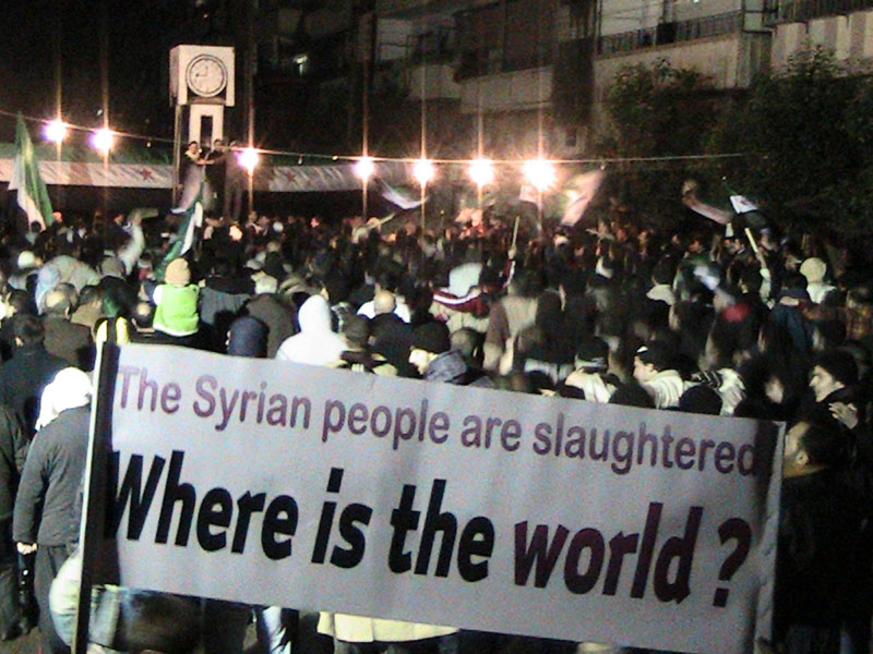 Demonstrators gather during a protest against Syria's President Assad in Homs on February 10. Bomb attacks killed at least 28 people in Syria's second city Aleppo on Friday, while Homs endured another day of shelling and a firefight broke out in Damascus, the nearest violence to the centre of the capital in an 11-month uprising. (Reuters)