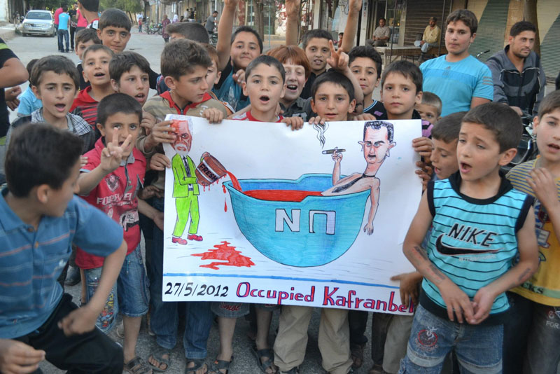 An image released by the Syrian opposition's Shaam News Network shows on May 27 an anti-regime demonstration by children in Kfar Nubul. (AFP)