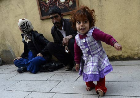A Syrian refugee family sits on the sidewalk in Istanbul. (AFP)