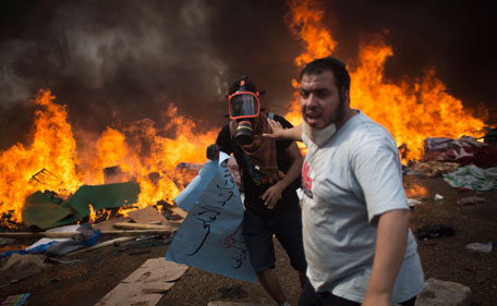 Members of the Muslim Brotherhood and supporters of ousted Egyptian President Mohamed Mursi run from tear gas during clashes with riot police and the army around the area of Rabaa Adawiya square, where the protesters are camping, in Cairo August 14, 2013. At least 95 Egyptians were killed on Wednesday after security forces moved in on protesters demanding the reinstatement of Mursi, and the government imposed a state of emergency as unrest swept the most populous Arab nation. (REUTERS)