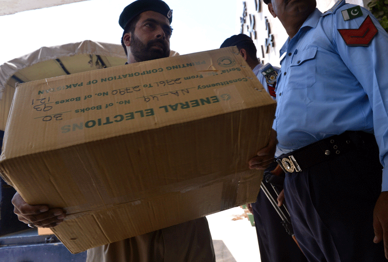 A Pakistani policeman unloads ballot papers box at a distribution centre in Islamabad on Friday. Pakistan goes to the polls on May 11, to elect a new government, the first time in the country's turbulent history that one civilian administration has handed power to another through the ballot box. (AFP)