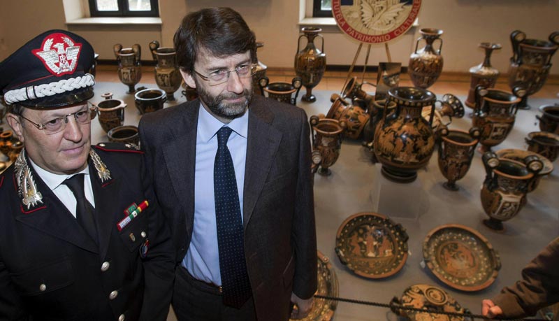 Carabinieri Gen. Mariano Mossa, left, and Italian Culture minister Dario Franceschini pose for photographers near antiquities displayed at Terme di Diocleziano museum during a press conference in Rome on Wednesday. (AP)