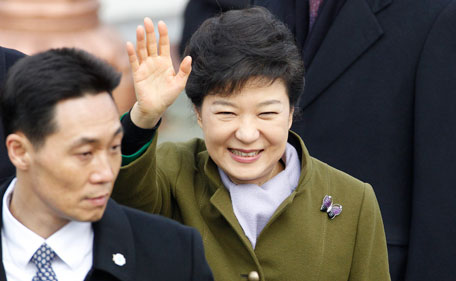 South Korea's new President Park Geun-hye waves as she leaves after her inauguration at parliament in Seoul February 25, 2013. Park became the first female president of South Korea on Monday, who is the daughter of a former military dictator Park Chung-hee who took power in a military coup in 1961 and ruled the country for 18 years. (REUTERS)