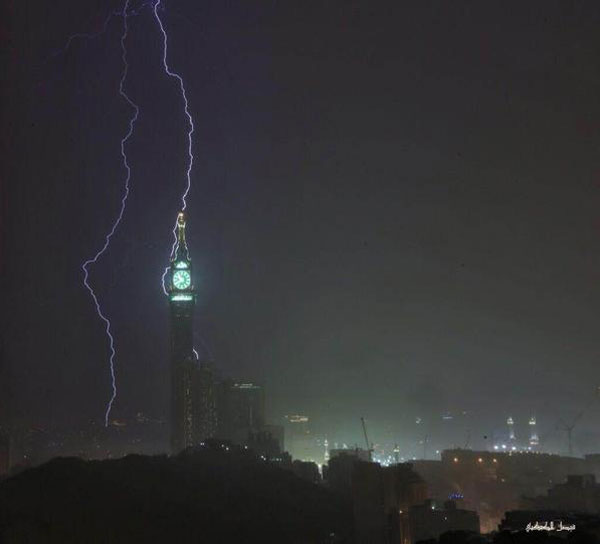 The 38-metre high tower that overlooks Islam’s holiest shrine was plunged into darkness after a blackout caused by lightning that hit the city for several hours on Thursday, the Arabic language daily Sabq said.