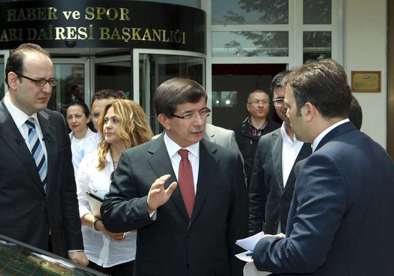 Turkey's Foreign Minister Ahmet Davutoglu (centre) leaves from TRT studios in Ankara on Sunday. (Reuters)
