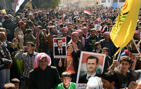 Palestinian refugees and inhabitants of the nearby Al Nairab refugee camp taking part in a rally in support of the Syrian President Bashar Al Assad (on placards), near the northern Syrian city of Aleppo. Western countries warned Syria over the fate of males detained during the evacuation from rebel-held areas of Homs city, as hopes rose that a humanitarian operation will resume. (AFP)