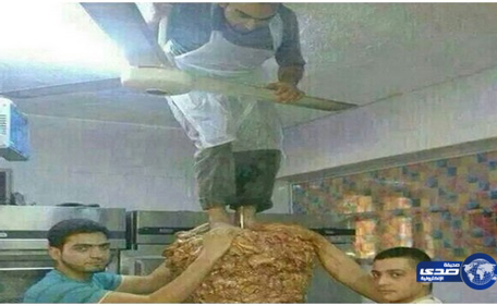 A picture showing the worker squeezing the shawarma meat on the bar with his feet with the help of two other workers was published on social networks in the Kingdom.