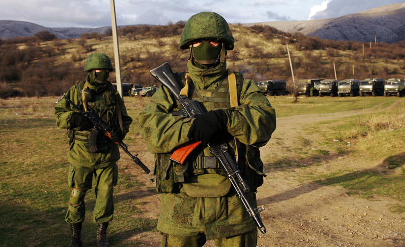 Russian forces pose as they block the Ukrainian unit in Perevalnoye, not far from Simferopol, on March 5, 2014. US Treasury Secretary Jacob Lew warned Russia on Wednesday that its actions in Ukraine have put its role in the elite Group of Eight club of leading nations at risk. (AFP)