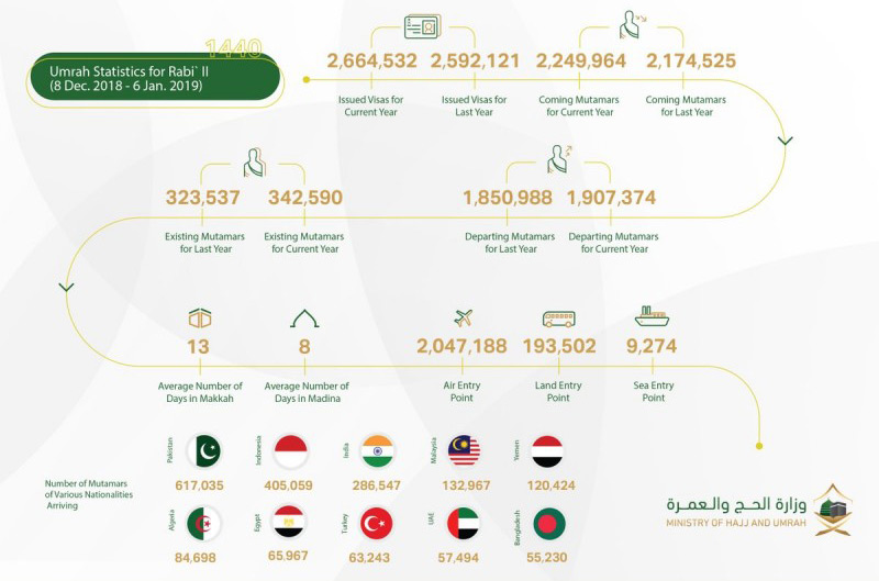 The number of visas issued for pilgrims entering Saudi Arabia to perform Umrah has reached 2.664 million, 2.79 percent up over the corresponding period last year, according to official statistics released by the Saudi Ministry of Hajj and Umrah for this Hijri year.