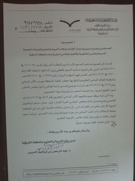 The letter, a copy of which was published by the Saudi Arabic language daily Sabq, said all schools in the eastern region are not permitted to export sheep, cow, goats, camels and horses to the other Gulf states without a royal permission.