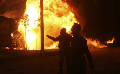 Men rush to a site hit by what activists say are barrel bombs dropped by government forces on Al Katerji district in Aleppo, January 21, 2014. (REUTERS)