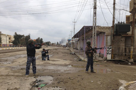 Iraqi security forces take position with their weapons during clashes with Al Qaeda-linked Islamic State in Iraq and the Levant (ISIL) in the city of Ramadi, 100 km (62 miles) west of Baghdad. (REUTERS)
