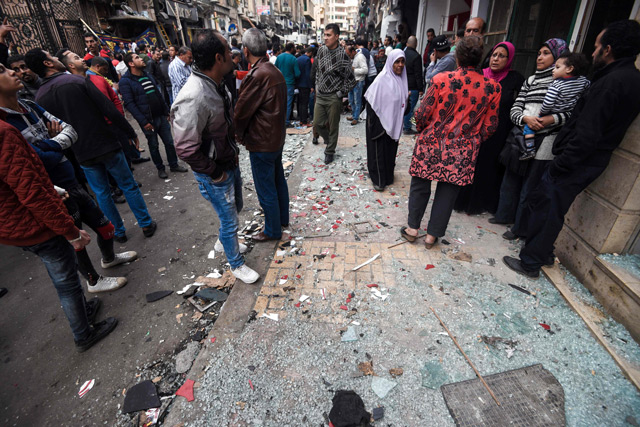 Egyptians gather by debris resulting from a blast which struck outside the Coptic Orthodox Patriarchate in Alexandria. (AFP)