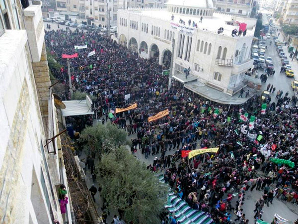 Demonstrators protesting against Syria's President Bashar al-Assad march through the streets in Adlb December 30, 2011. Syrian security forces, undaunted by the presence of Arab League observers, have killed at least 12 protesters as hundreds of thousands demonstrated against the government of President Bashar al-Assad, opposition activists said. (REUTERS)