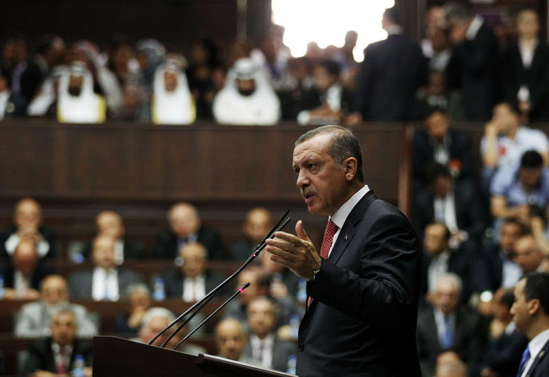 Turkey's Prime Minister Tayyip Erdogan addresses members of parliament from his ruling AK Party (AKP) during a meeting at the Turkish parliament in Ankara on Tuesday June 26. (Reuters)