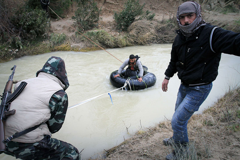 Members of the Free Syrian Army moving weapons, medicine and personnel across a river near Al Janoudiyah in Idlib province of Syria on February 23. (AFP)