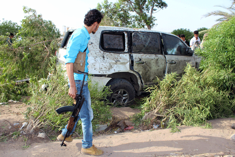 Fighters loyal to Yemen's President Abedrabbo Mansour Hadi check the destroyed vehicle of the newly appointed Aden Governor Aidarus Al Zubaidi after he was targeted alongside two other senior south Yemeni officials in a bomb attack in the Inma district, north of Aden, on January 4, 2016. (AFP)