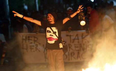 An anti-government protester gestures during a demonstration in Ankara late June 2, 2013. Tens of thousands of people took to the streets in Turkey's four biggest cities on Sunday and clashed with riot police firing tear gas in the third day of the fiercest anti-government protests in years. Prime Minister Tayyip Erdogan blamed the main secular opposition party for inciting the crowds, whom he called "a few looters", and said the protests were aimed at depriving his ruling AK Party of votes as elections begin next year. (REUTERS)