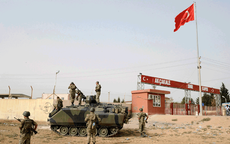 Turkish soldiers take their position at the Akcakale border gate in southern Sanliurfa province. Turkey returned fire after Syrian mortar bombs landed in a field in southern Turkey on Saturday, the day after Prime Minister Tayyip Erdogan warned Syria that Turkey would not shy away from war if provoked. It was the fourth day of Turkish retaliation for firing by Syrian forces that killed five Turkish civilians on Wednesday. (REUTERS)
