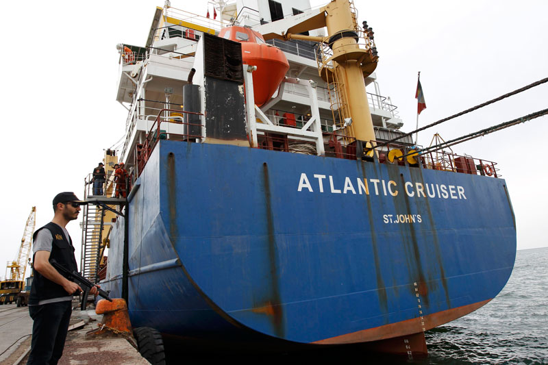 A special police officer of the customs narcotic and smuggling department stands near the ship Atlantic Cruiser, sailing under the colours of Antigua and Barbuda, in the port of Iskenderun on April 18, 2012. A ship suspected of carrying weapons and ammunition and believed to be heading for Syria docked at Turkey's Mediterranean Iskenderun port on Wednesday after receiving a U.N. warning to change its course, local media reported. (Reuters)