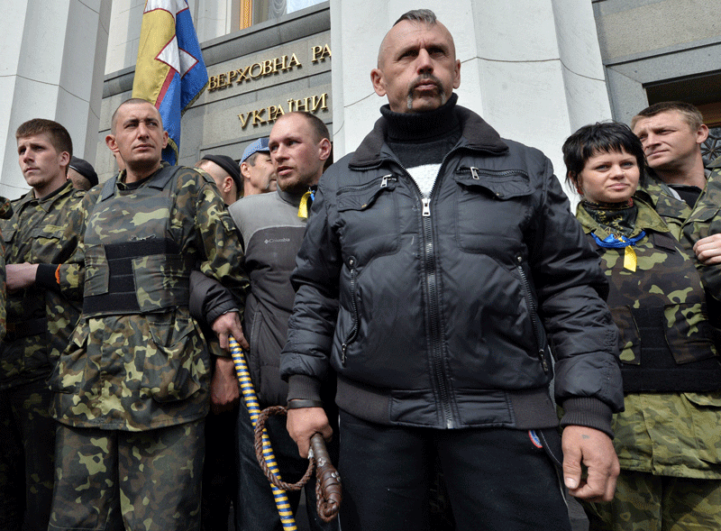 Maidan self-defence activists guard the Ukrainian Parliament in Kiev during a session, on April 15, 2014, as protesters outside the building demand authorities to take actions against separatism on the eastern part of the country. Russian Foreign Minister Sergei Lavrov on Tuesday warned Kiev against using force to quell pro-Moscow separatists in eastern Ukraine, saying the "criminal" act would undermine talks planned in Geneva. (AFP)