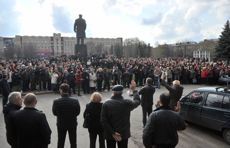Pro-Russia supporters rally outside the regional administration building seized and guard by armed men in the eastern Ukrainian city of Slavyansk on April 14. Ukraine's latest ultimatum to pro-Kremlin militias who have seized buildings across a swath of the separatist east expired on April 14 without any sign of the gunmen ready to give in. (AFP)