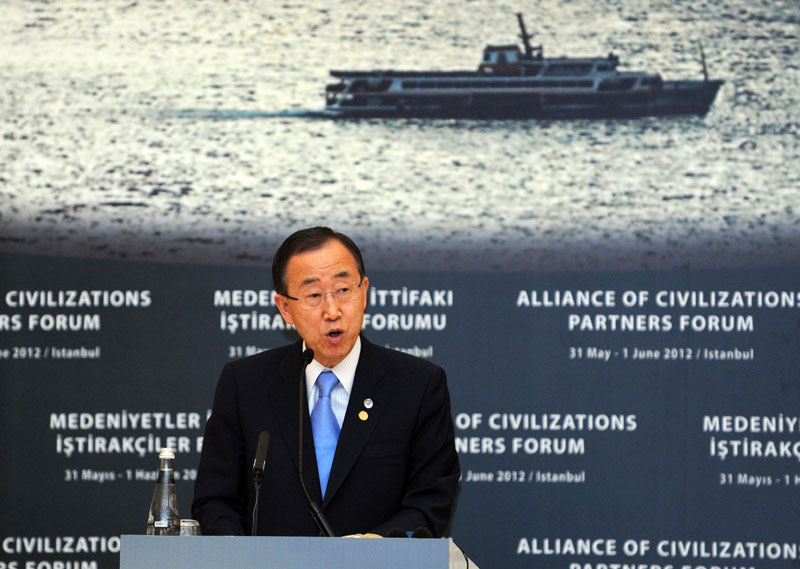 UN Secretary-General Ban Ki-moon speaks during the Alliance of Civilisations Partners Forum in Istanbul, on Thursday May 31. UN Secretary-General Ban Ki-moon urged Syria to honour its commitment to a peace plan drawn up by international mediator Kofi Annan after the massacre of more than 100 civilians in Houla. (AFP)