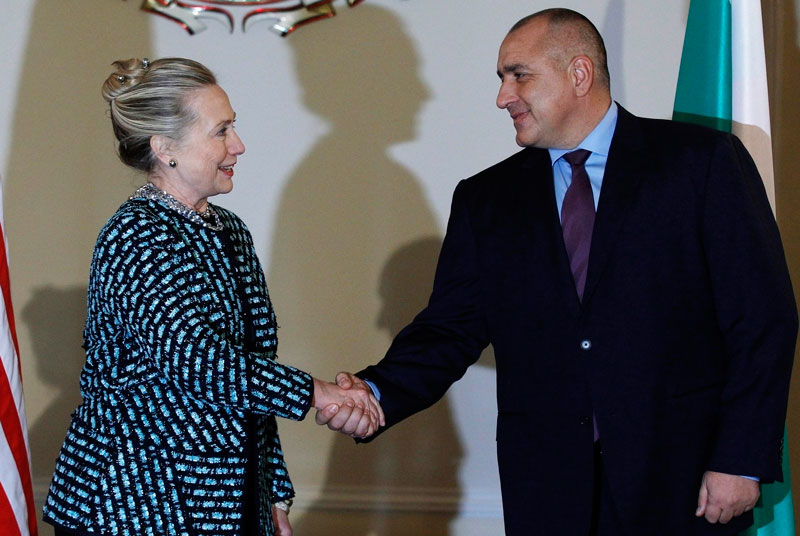 Bulgaria's Prime Minister Boiko Borisov (right) welcomes US Secretary of State Hillary Clinton before their meeting in Sofia on Sunday. (AFP)