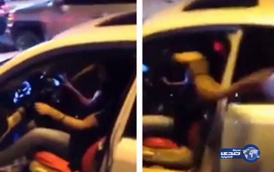 A brief YouTube showed a group of men booed and shoved their way towards the car before one of them opened the door, triggering a scream by the woman.