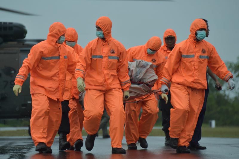 Members of an Indonesian search and rescue team carry items for investigation, found during the search operation for the missing AirAsia flight 8501, after being delivered by a Singapore Super Puma helicopter from the Republic of Singapore Air Force (RSAF) ‘RSS Persistence’ in Pangkalan Bun on January 4, 2015. (AFP)