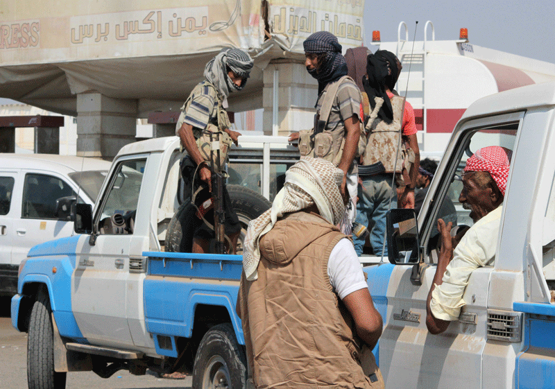 Yemeni fighters of the Popular Resistance Committees, supporting forces loyal to Yemen's President Abedrabbo Mansour Hadi, patrol a street in the southern port city of Aden on November 1, 2015. (AFP)