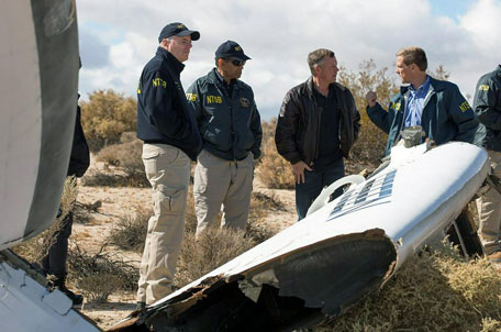 In this Nov 1, 2014, photo provided by the National Transportation Safety Board, Virgin Galactic pilot Todd Ericson, right, talks with NTSB Acting Chairman Christopher A. Hart, second from left, at the SpaceShipTwo accident site with investigators in Mojave, Calif.(AP)