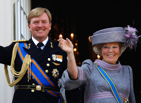 Netherlands' Queen Beatrix (R) and her son Crown Prince Willem-Alexander are seen waving to well-wishers from the balcony of the Royal Noordeinde Palace after opening the new parliamentary year in The Hague on this April 15, 2011 file photo. (REUTERS)