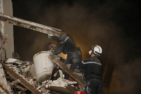 Firefighters search the rubble of a four-storey residential building which collapsed following a blast. (AFP)