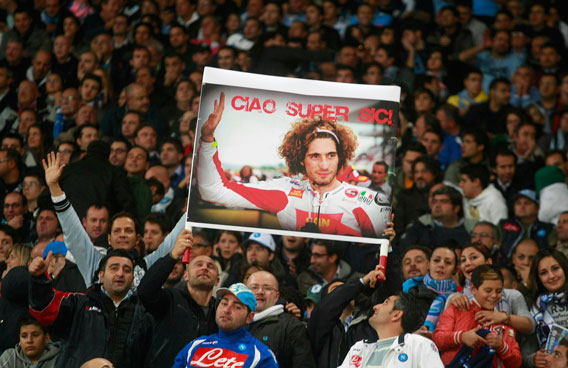 Napoli's supporters hold a banner depicting Honda MotoGP rider Marco Simoncelli during their Serie A soccer match against Udinese at San Paolo stadium in Naples October 26, 2011. Simoncelli died after a horrific crash at the Malaysian Grand Prix in Sepang on October 23, 2011. (REUTERS)